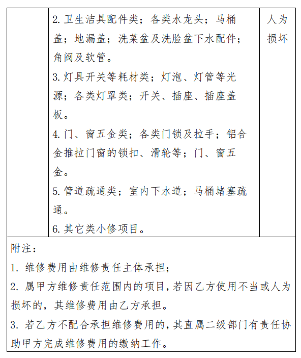 (四)因承租人使用不当,致使该房屋及其附属设施损坏或发生故障的,承租人应负责维修,维修所产生的费用由承租人承担。若承租人未能将房屋及附属设施、设备修复到位,学校将代履行修复工作,所产生费用将从承租人缴纳的房屋租赁保证金中扣取,租赁保证金未到租赁期满不退;不足以抵扣的,承租人应据实予以补足。附属设施维修范围划分详见附件。