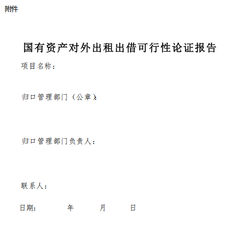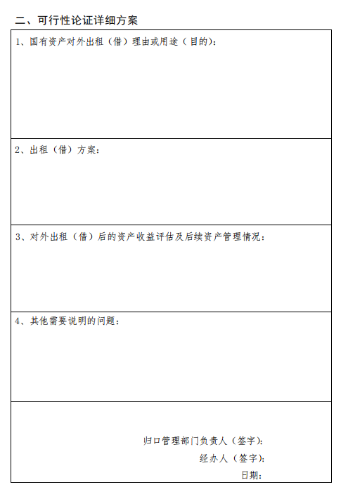 (一)方案论证:出租出借应当开展可行性研究。可行性论证报告包括但不限于拟出租出借资产的详细现状、出租出借的目的与用途、出租出借年限和参考周边同类物业租金水平的租金估值等。可行性研究报告应当在单位内进行公示,公示期不少于 5个工作日。
