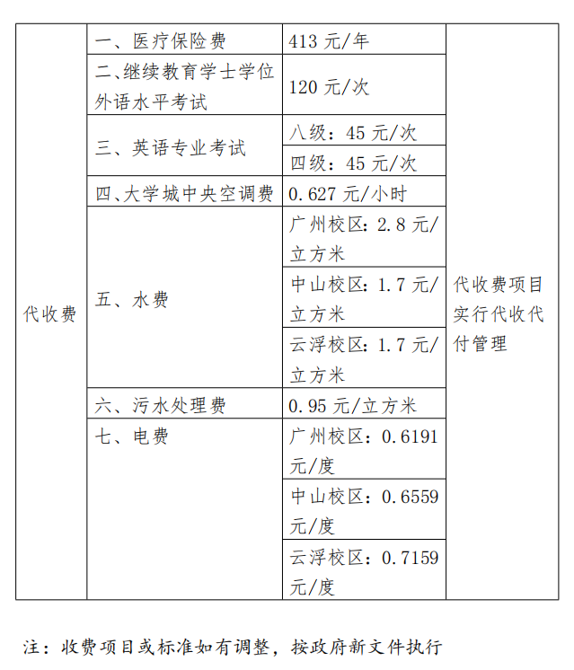 (二)代收费:代收医疗保险费、水电费、大学城中央空调费、上级主管部门的考试费以及国家、省要求代收的其他费用。