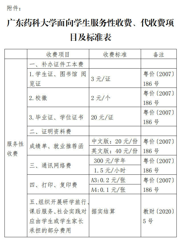 附件:广东药科大学面向学生服务性收费、代收费项目及标准表